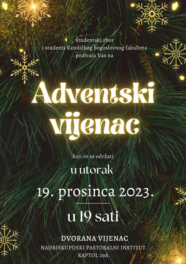 Kulturno – umjetnički i zabavni program pod nazivom „Adventski vijenac“ održat će se 19. prosinca 2023. s početkom u 19:00 sati u dvorani „Vijenac“ (Kaptol 29a).