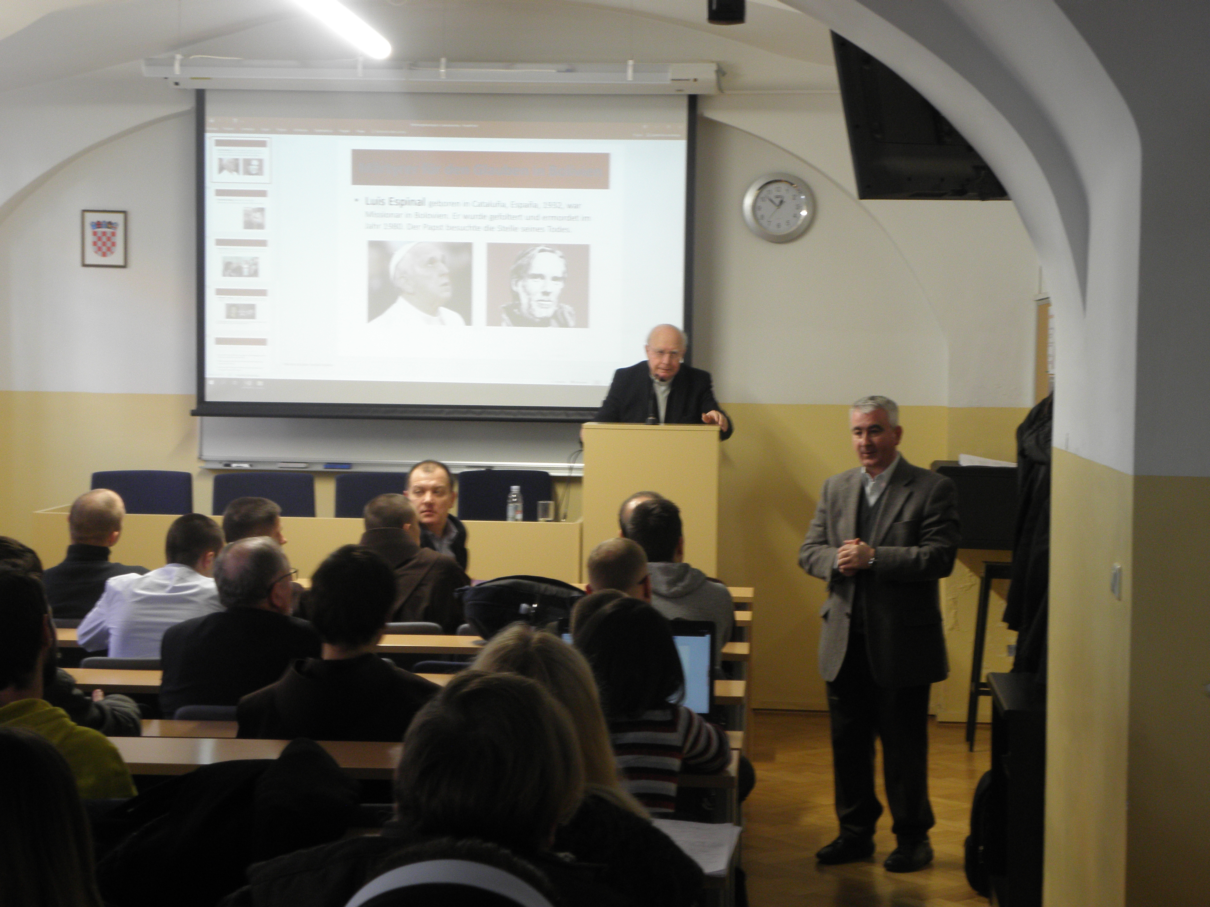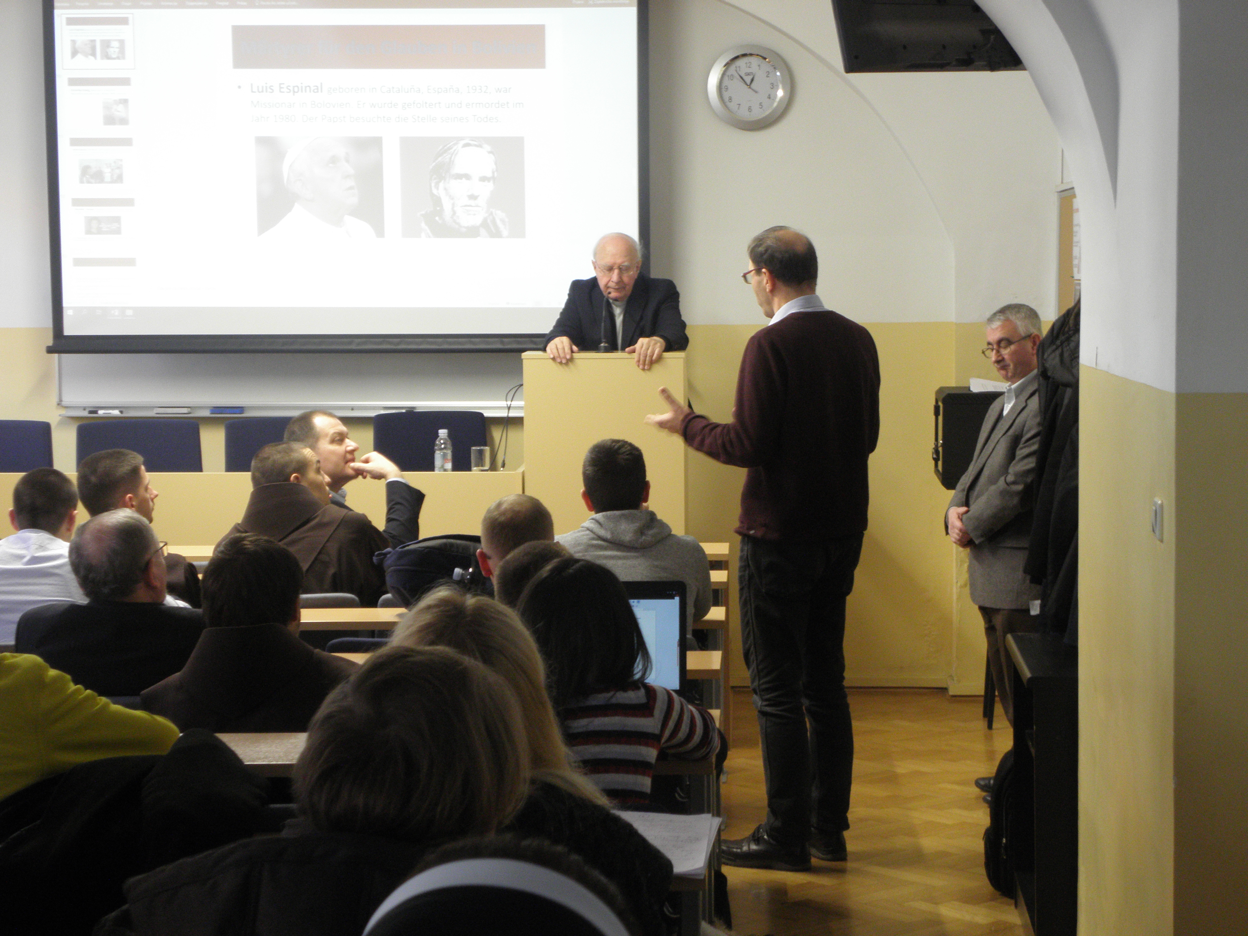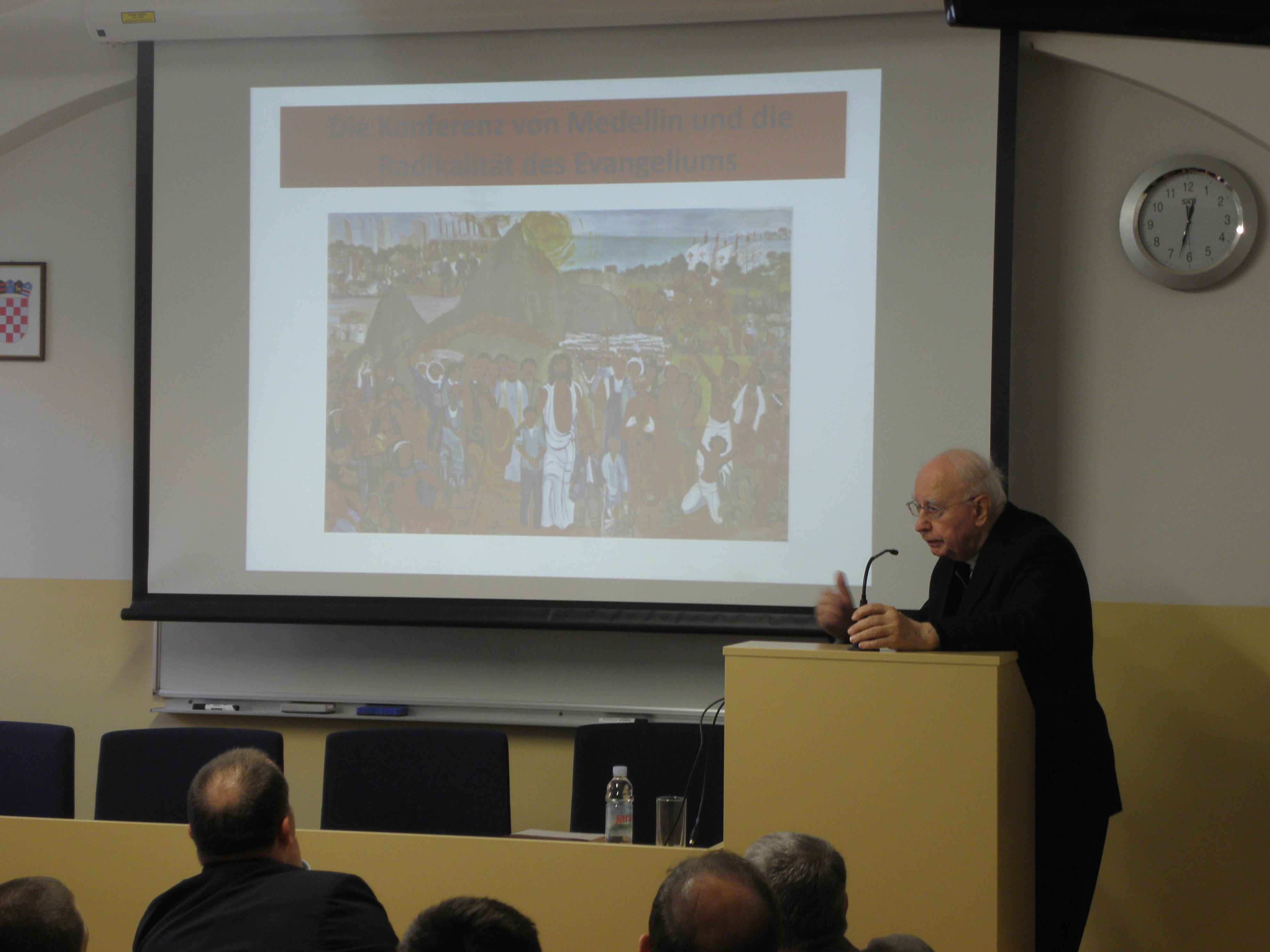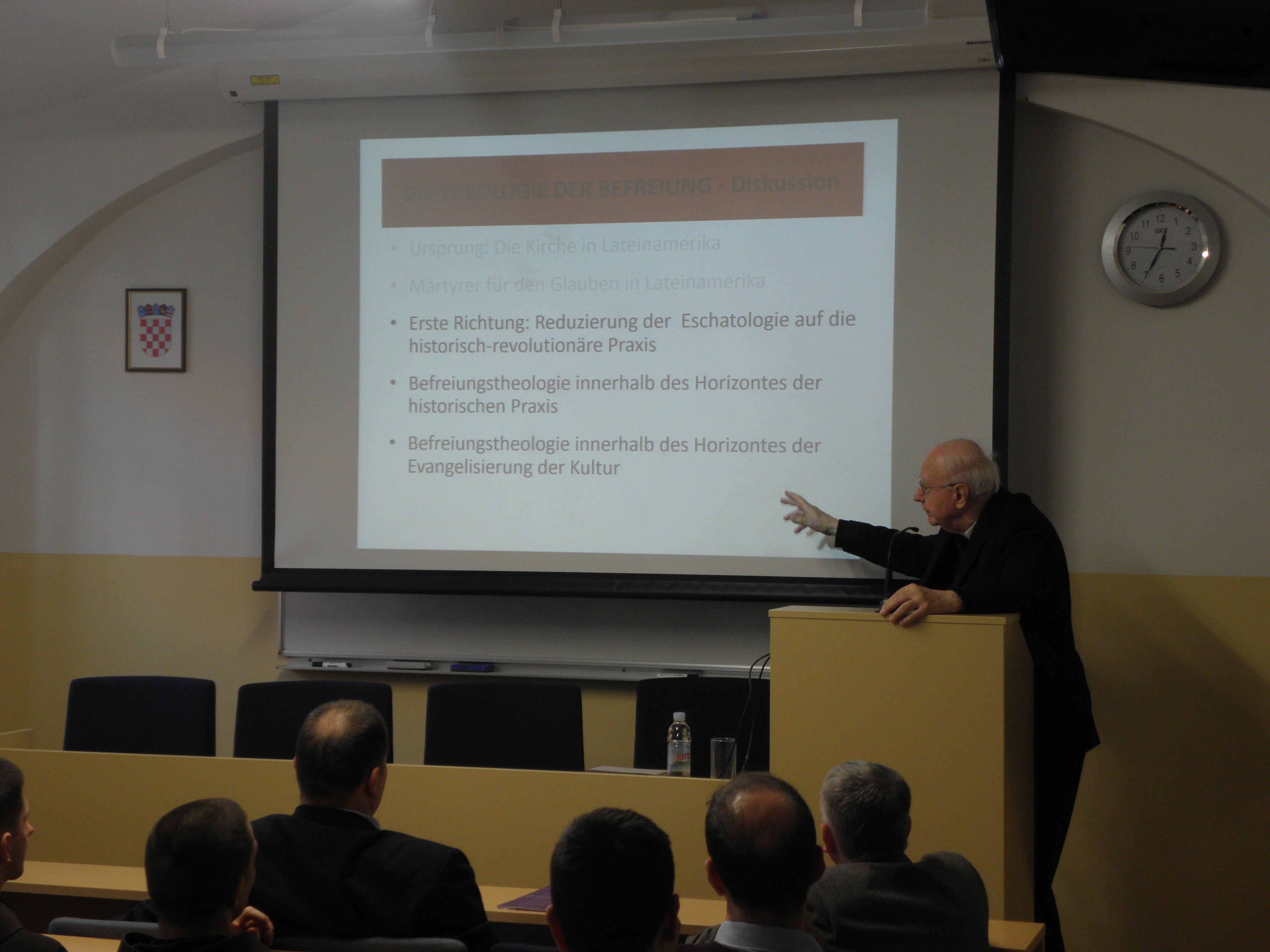 Nakon uvodnih pozdrava koje je u ime Fakulteta uputio prof. dr. sc. Mario Cifrak, gostujući predavač prof. dr. dr. Pablo Sudar započeo je predavanje prezentacijama o žrtvama, mučenicima i svjedocima vjere u Južnoj Americi. Potom je iznio neke aspekte utjecaja Crkve u Latinskoj Americi tijekom povijesti, ističući kako je Crkva uz pomoć misionara stoljećima aktivno radila na približavanju i pokušaju integracije dvaju kultura, europske i latinoameričke. Središnji dio predavanja problematizirao je teologiju oslobođenja koja se, kao jedno od poznatih teoloških usmjerenja XX. stoljeća, nakon II. vatikanskog koncila razvila u svoja tri klasična oblika ili linije. Prva je linija bila poznata po reduciranju eshatologije na povijesno-revolucionarno djelovanje te obilježena tada prilično raširenim marksističkim revolucionarnim i komunističkim idejama i pokretima, a kao njegov predstavnik može se izdvojiti Hugo Assmann. Druga linija je teologiju oslobođenja smještala unutar horizonta povijesnoga djelovanja, a njezini najznačajniji i najistaknutiji teolozi bili su Gustavo Gutiérrez i Leonardo Boff. Treća je linija teologiju oslobođenja promatrala unutar horizonta evangelizacije kulture, podržavalo ju je i promoviralo Vijeće biskupskih konferencija Latinske Amerike (CELAM) koje je još 1955. godine osnovao papa Pio XII., a danas je najraširenija linija teologije oslobođenja u Katoličkoj Crkvi. Govoreći o praktičnom i duhovnom životu vjernika u Južnoj Americi, profesor Sudar je istaknuo da sensus fidelium pokazuje i svjedoči o sensus fidei, odnosno da se sensus fidei očituje upravo u sensus fidelium. Potrebno je stoga, u skladu s naukom II. vatikanskog koncila, prepoznavati znakove vremena (signa tempora), neprestano ih analizirati, teološki vrednovati te se u njihovom ozračju i angažirati. Budući da u Južnoj Americi mnogo novca dolazi od droge, javlja se problem manipulacije onih koji nad time imaju moć jer ju ne koriste da razvijaju ljude nego da se ljudi međusobno zbog droge ubijaju. Crkva je pozvana živjeti i djelovati i u toj situaciji te u Južnu Ameriku donijeti oslobođenje.