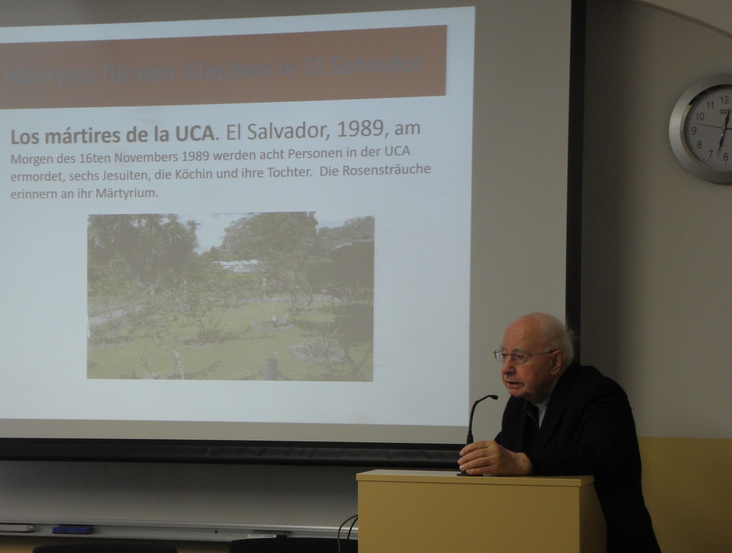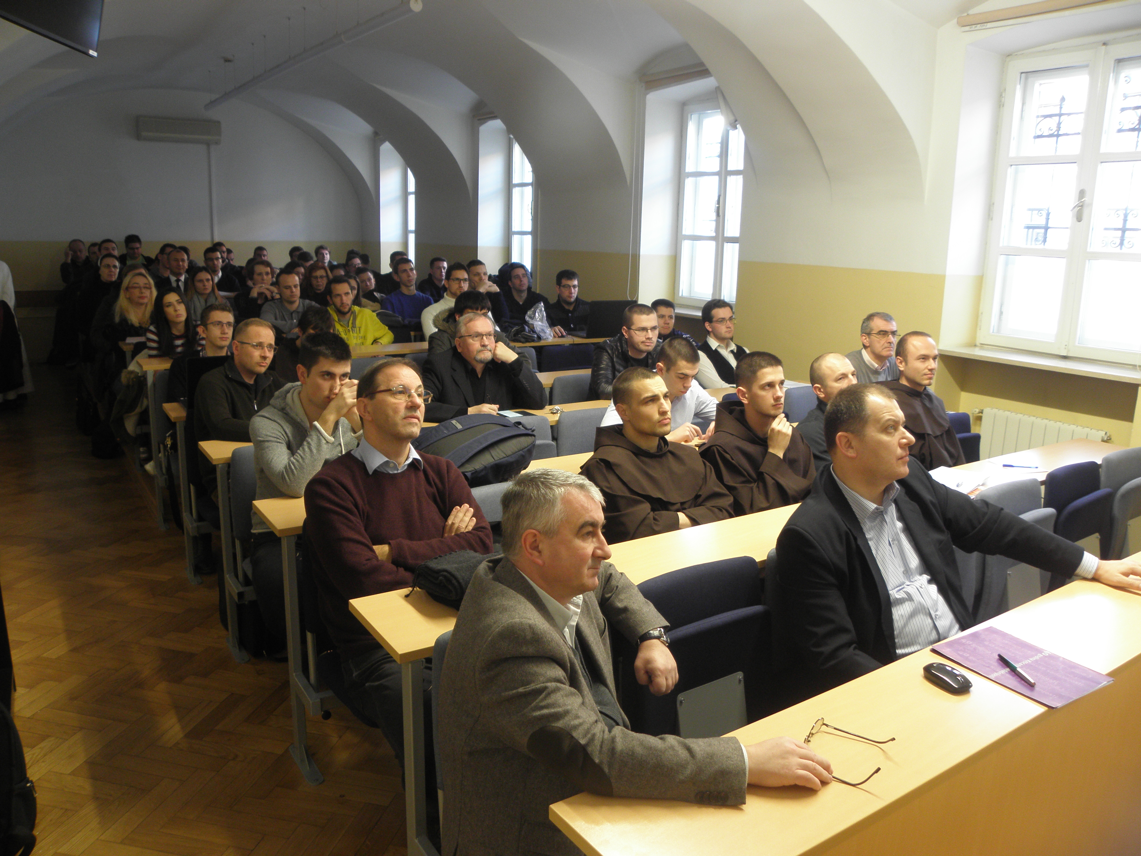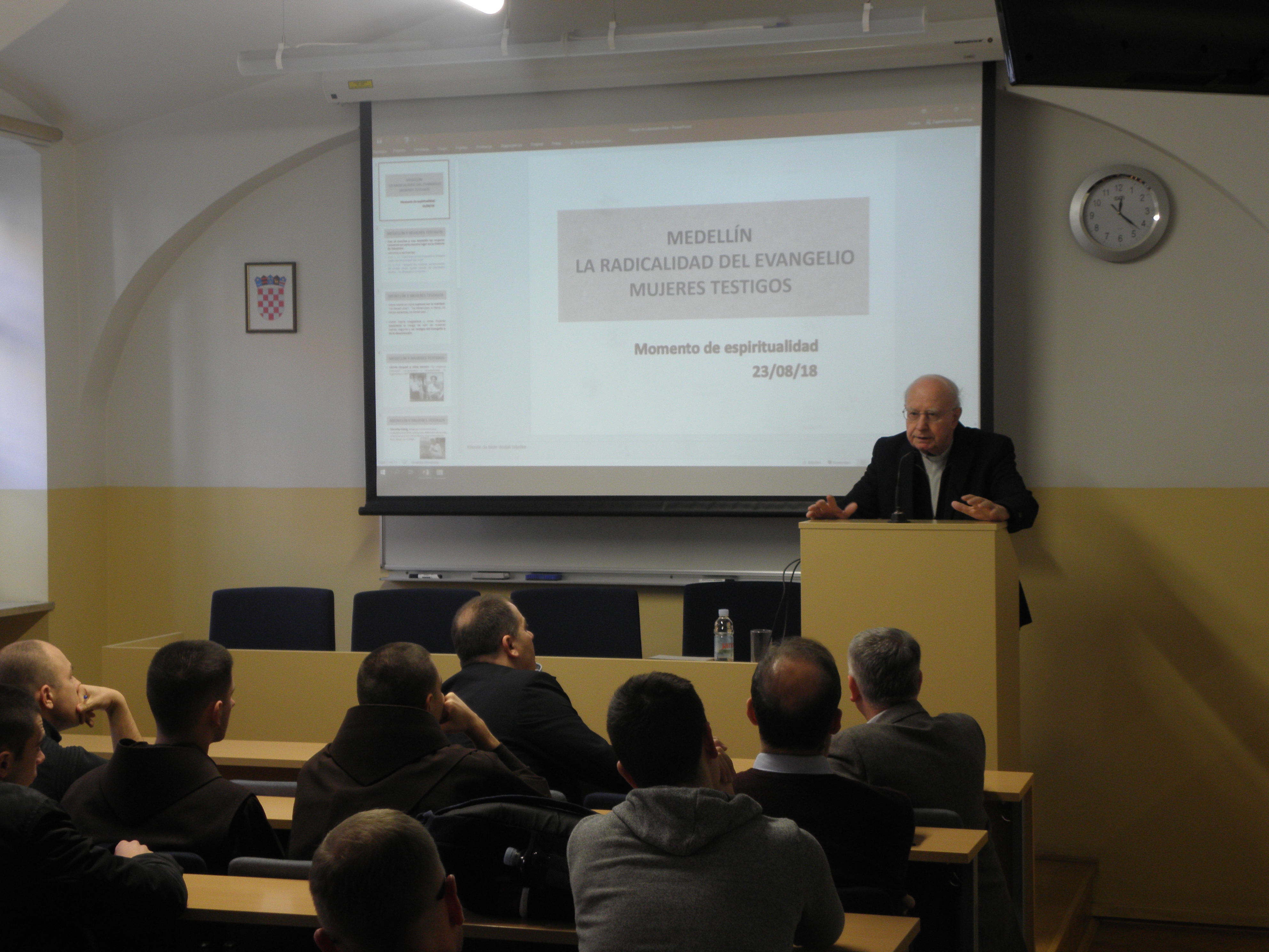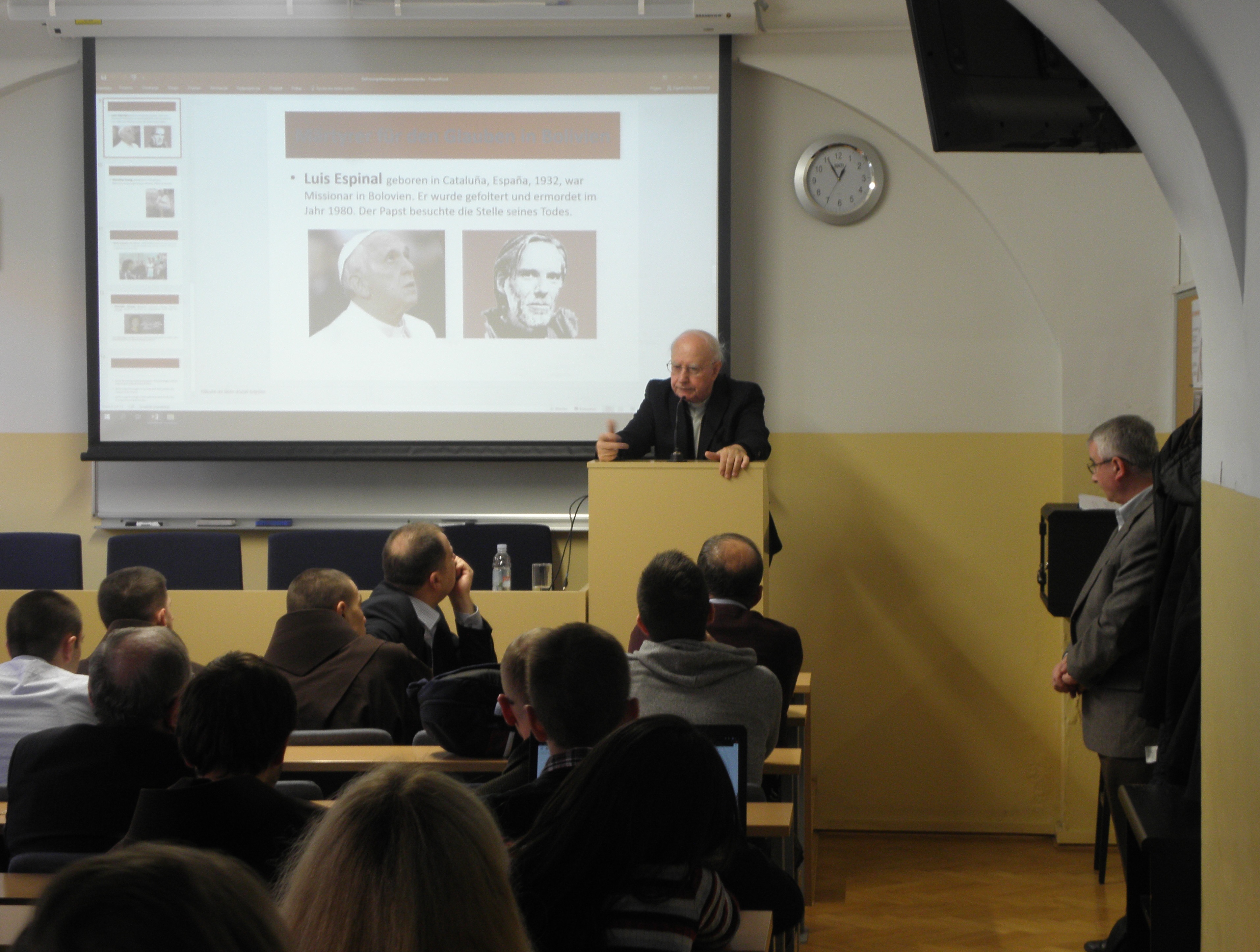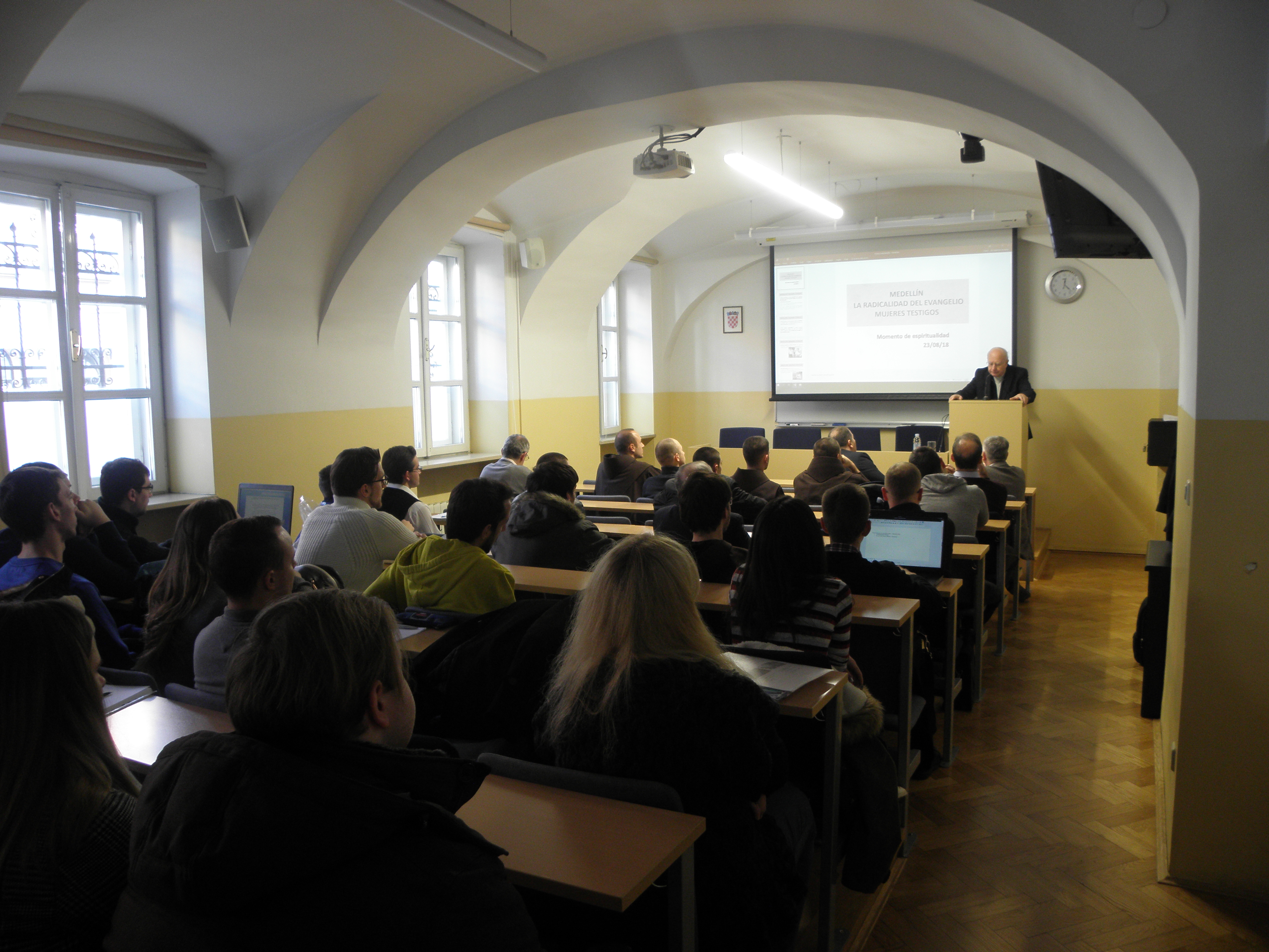 Nakon uvodnih pozdrava koje je u ime Fakulteta uputio prof. dr. sc. Mario Cifrak, gostujući predavač prof. dr. dr. Pablo Sudar započeo je predavanje prezentacijama o žrtvama, mučenicima i svjedocima vjere u Južnoj Americi. Potom je iznio neke aspekte utjecaja Crkve u Latinskoj Americi tijekom povijesti, ističući kako je Crkva uz pomoć misionara stoljećima aktivno radila na približavanju i pokušaju integracije dvaju kultura, europske i latinoameričke. Središnji dio predavanja problematizirao je teologiju oslobođenja koja se, kao jedno od poznatih teoloških usmjerenja XX. stoljeća, nakon II. vatikanskog koncila razvila u svoja tri klasična oblika ili linije. Prva je linija bila poznata po reduciranju eshatologije na povijesno-revolucionarno djelovanje te obilježena tada prilično raširenim marksističkim revolucionarnim i komunističkim idejama i pokretima, a kao njegov predstavnik može se izdvojiti Hugo Assmann. Druga linija je teologiju oslobođenja smještala unutar horizonta povijesnoga djelovanja, a njezini najznačajniji i najistaknutiji teolozi bili su Gustavo Gutiérrez i Leonardo Boff. Treća je linija teologiju oslobođenja promatrala unutar horizonta evangelizacije kulture, podržavalo ju je i promoviralo Vijeće biskupskih konferencija Latinske Amerike (CELAM) koje je još 1955. godine osnovao papa Pio XII., a danas je najraširenija linija teologije oslobođenja u Katoličkoj Crkvi. Govoreći o praktičnom i duhovnom životu vjernika u Južnoj Americi, profesor Sudar je istaknuo da sensus fidelium pokazuje i svjedoči o sensus fidei, odnosno da se sensus fidei očituje upravo u sensus fidelium. Potrebno je stoga, u skladu s naukom II. vatikanskog koncila, prepoznavati znakove vremena (signa tempora), neprestano ih analizirati, teološki vrednovati te se u njihovom ozračju i angažirati. Budući da u Južnoj Americi mnogo novca dolazi od droge, javlja se problem manipulacije onih koji nad time imaju moć jer ju ne koriste da razvijaju ljude nego da se ljudi međusobno zbog droge ubijaju. Crkva je pozvana živjeti i djelovati i u toj situaciji te u Južnu Ameriku donijeti oslobođenje.