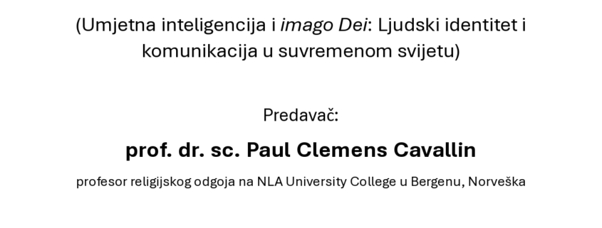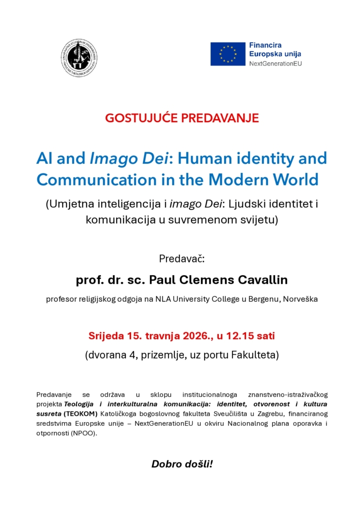 Na Katoličkom bogoslovnom fakultetu Sveučilišta u Zagrebu prof. dr. sc. Paul Clemens Cavallin održat će gostujuće predavanje, na engleskom jeziku, o temi: AI and Imago Dei: Human identity and Communication in the Modern World (Umjetna inteligencija i imago Dei: Ljudski identitet i komunikacija u suvremenom svijetu). Predavanje će se održati u srijedu 15. travnja 2026., od 12.15 do 14.00 sati, u dvorani 4 (prizemlje desno, uz portu Fakulteta).