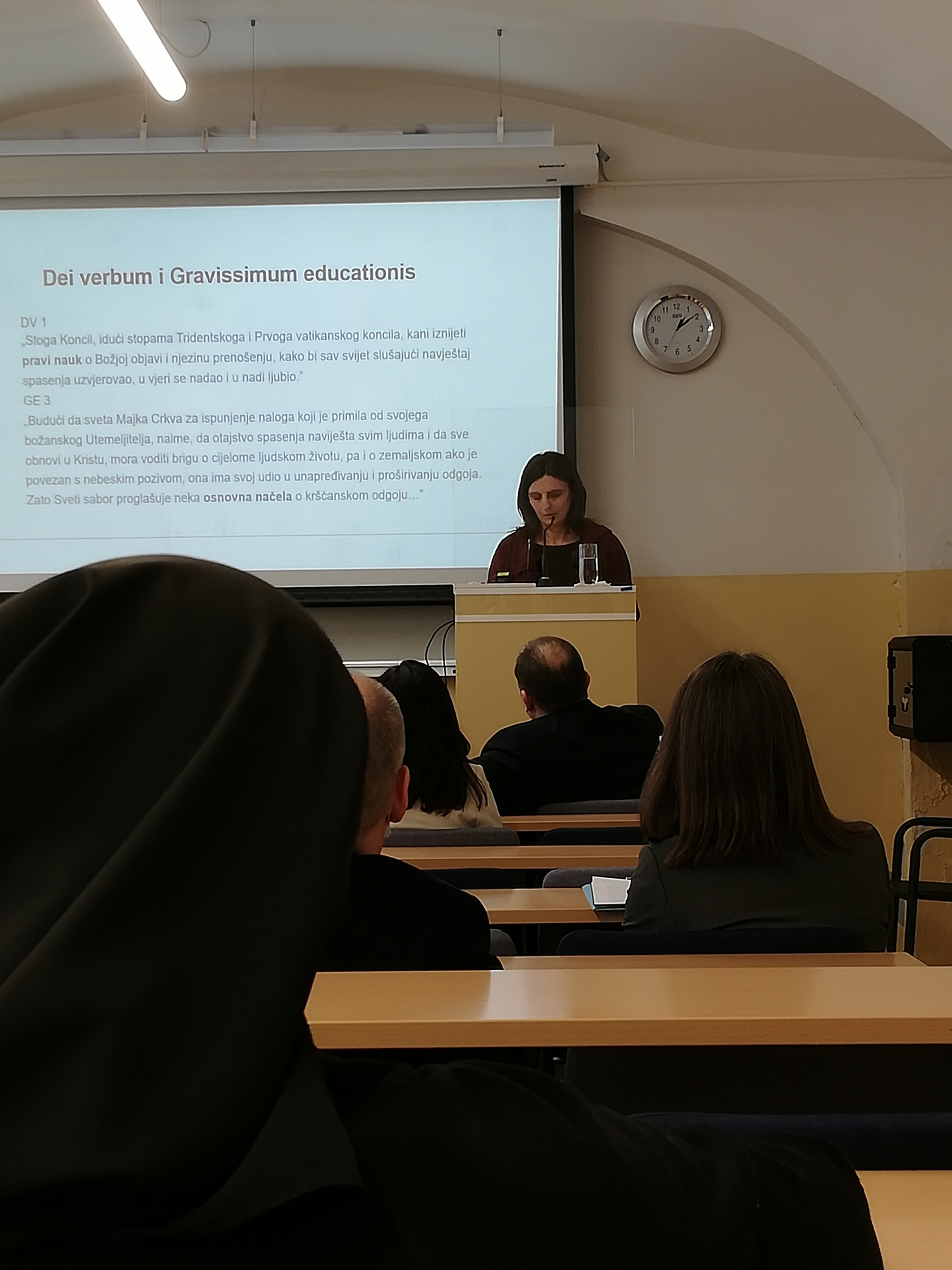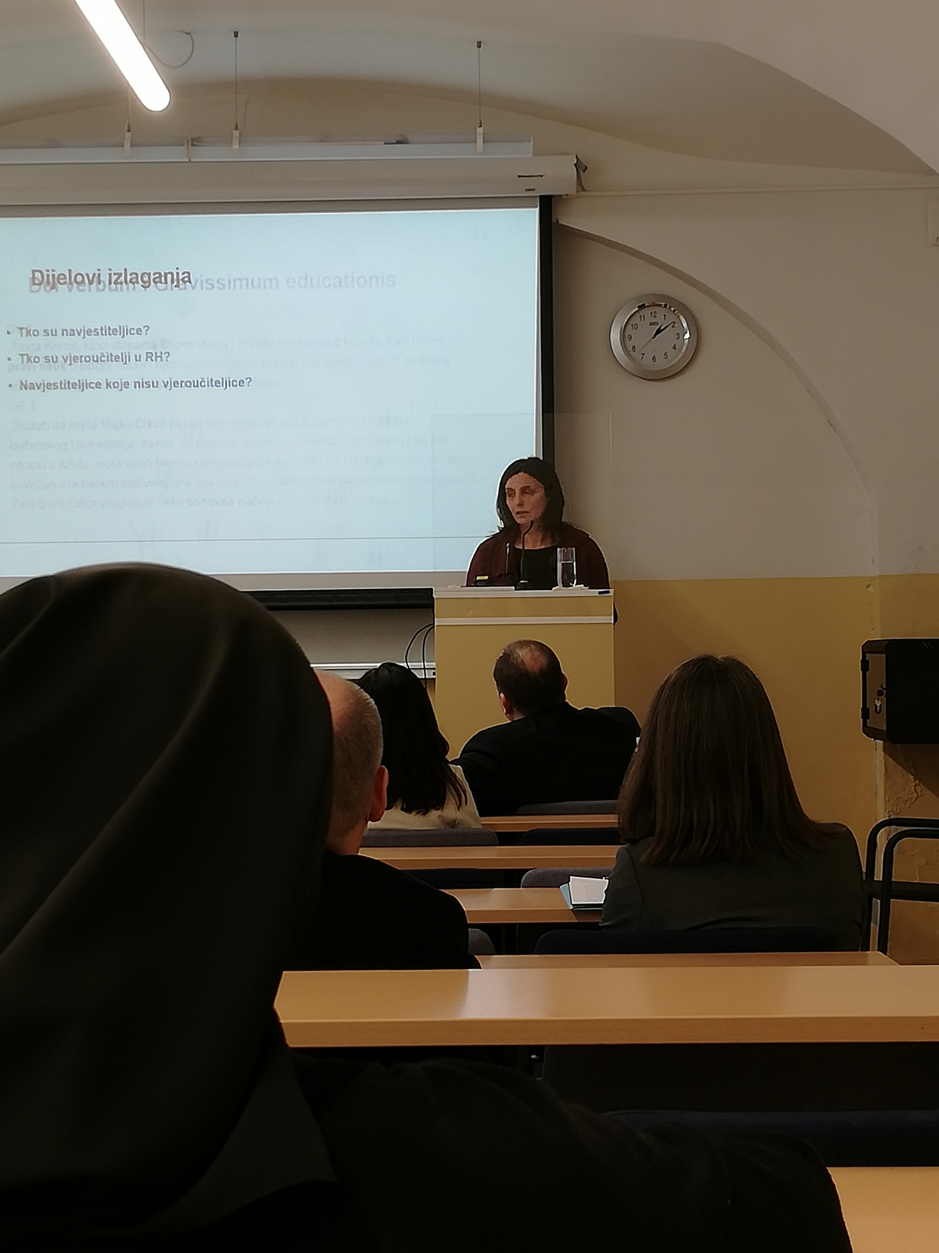 Mr. sc. Gordana Barudžija progovorila je o angažmanu žena navjestiteljica u Crkvi danas, analizirala pojmove „naviještanje“, „evangelizacija“ i „kateheza“, povezujući naviještanje kao sastavni dio govora o evangelizaciji i katehezu kao jedan vid navještaja (sadržaj – Dei Verbum, br. 1; načela – Gravissimum Educationis, br. 3). Svoje je predavanje podijelila na tri dijela: Tko su navjestiteljice?; Tko su vjeroučitelji u Republici Hrvatskoj?; Tko su navjestiteljice koje nisu vjeroučiteljice? Postavljajući si ta pitanja, istraživanjem je došla do sljedećih zaključaka: narod Božji, svi vjernici su sakramentom krštenja pozvani naviještati Radosnu vijest svatko svojim talentima/darovima. Među njima se posebno ističu katehisti (muškarci i žene) te vjeroučitelji i vjeroučiteljice kao službeni navjestitelji Crkve, a čije su glavne metode evangelizacije propovijedanje, svjedočenje životom, sakramenti, pučka pobožnost, mas-mediji (usp. Catechesi Tradendae; Evangelii Gaudium). Važno je pritom uzeti u obzir dokumente II. vatikanskog koncila (Ad Gentes, br. 17), Kodeks kanonskoga prava (kan. 759), enciklike papa (Pavao VI., Ivan Pavao II. – Catechesi Tradendae, Benedikt XVI. – m.p. kojim se uspostavlja Papinsko vijeće za promicanje nove evangelizacije, Franjo – Evangelii Gaudium), kao i Ugovore između Svete Stolice i Republike Hrvatske o suradnji na području odgoja i obrazovanja, Ugovor o katoličkom vjeronauku u javnim školama i vjerskom odgoju u javnim predškolskim ustanovama (1999.), Poruku hrvatskih biskupa o vjeronauku u školi i župnoj katehezi (2000.), HBK, Na svetost pozvani. Pastoralne smjernice na početku trećeg tisućljeća (2002.). Vjeroučitelji u Republici Hrvatskoj su, u skladu s generičkim govorom (u planovima i programima te kurikulumima), većinom žene – vjeroučiteljice koje rade u osnovnim i srednjim školama, napreduju u zvanju te je više žena mentorica i savjetnika – istaknula je mr. sc. Gordana Barudžija. Nasuprot tome, u službi predstojnika katehetskih ureda više je muškaraca. Žene navjestiteljice – autorice tekstova objavljenih u znanstvenim časopisima Bogoslovska smotra, Crkva u svijetu, Obnovljeni život, Diacovensia, Riječki teološki časopis jesu književnice, pjesnikinje, umjetnice, prevoditeljice, novinarke, znanstvenice, čiji je profesionalni rad naviještanje kao svjedočenje životom. Na kraju ostaju otvorena pitanja: Koliko se jasno izražavamo u komunikaciji?, Bi li promijenjen način izražavanja doprinio promjeni stava prema ženama?, Ako je stav prema ženama na bilo koji način negativan, kako to da i dalje poučavaju?, te Trebaju li nam istraživanja o vjeroučiteljicama i kako one doživljavaju svoju službu/služenje Crkvi i društvu?
