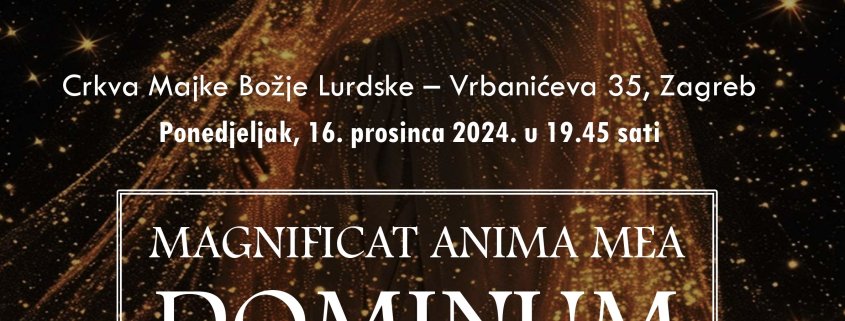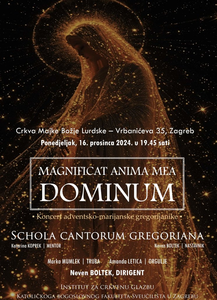Schola cantorum gregoriana Instituta za crkvenu glazbu Katoličkoga bogoslovnog fakulteta u ponedjeljak, 16. prosinca 2024. u 19,30 sati održat će koncert adventsko-marijanske gregorijanike Magnificat anima mea Dominum u Crkvi Majke Božje Lurdske u Zagrebu, Vrbanićeva 35.