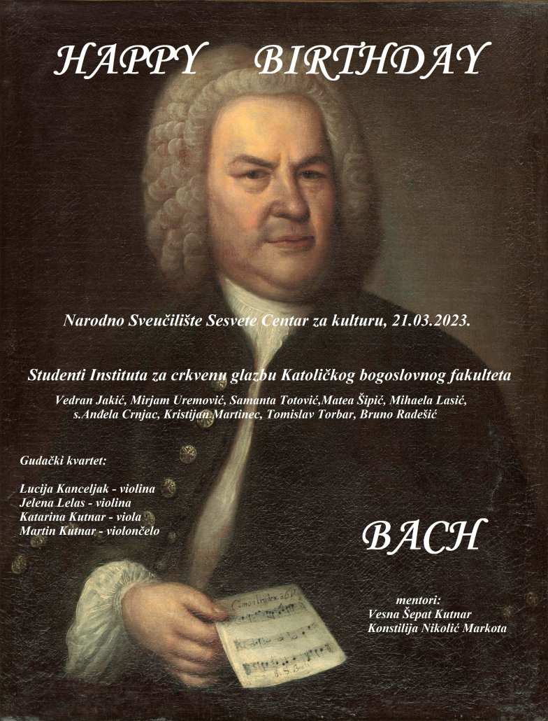 U utorak, 21. 3. 2023. godine, na dan rođenja Johanna Sebastiana Bacha, studenti Instituta za crkvenu glazbu KBF-a Sveučilišta u Zagrebu održali su koncert u Narodnom Sveučilištu Sesvete interpretirajući na klaviru izabrana djela ovog velikana glazbene umjetnosti.