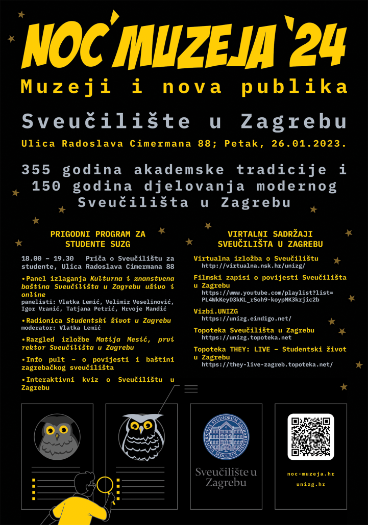 Sveučilište u Zagrebu tradicionalno sudjeluje u manifestaciji Noć muzeja predstavljanjem svoje bogate povijesne, kulturne i akademske baštine. Kako se u akademskoj godini 2023./2024. obilježava 355 godina djelovanja i 150 godišnjicu utemeljenja modernog Sveučilišta, potaknuti temom 19. Noći muzeja „Muzeji i nova publika“ želi se sveučilišni život i tradiciju posebno približiti studentima.