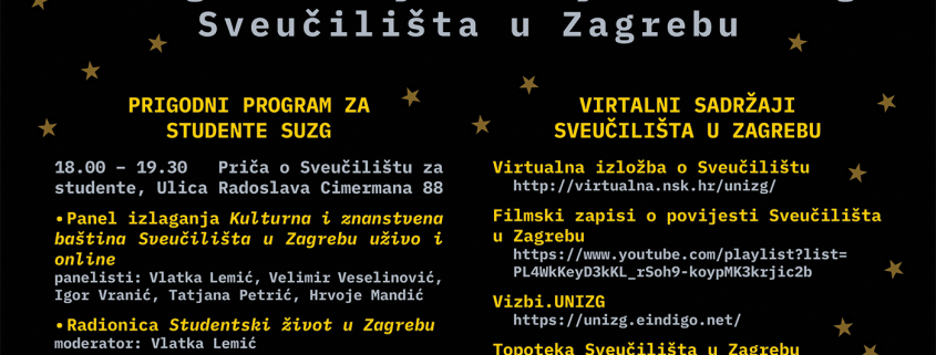 - U novom prostoru Rektorata (zgrada SEECEL) od 18,00 do 19,30 sati u petak 26. siječnja organizira se prigodni program uživo za naše studente u kojem će izravno moći upoznati povijesni razvoj i djelovanje Sveučilišta u Zagrebu, načine čuvanja i predstavljanja akademske baštine te na koji način studenti mogu aktivno doprinijeti sveučilišnoj priči.