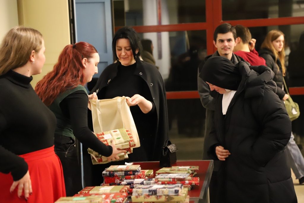 Nakon dekanovog govora, okupljene je pozdravila i predsjednica Studentskog zbora Gabrijela Ćurić koja je istaknula da „upravo događaj Božića kojega ovdje slavimo pokazuje nam put nade, mira, ljubavi, međusobnog razumijevanja i uvažavanja.“ zbog čega nas je pozvala da gledamo u jasle, „mjesto gdje životinje nalaze svoju hranu, a sada u njima leži Onaj koji sam sebe naziva kruhom koji silazi s neba – hranom koja čovjeku daruje istinski, vječni život“. Napomenula je da „iz jaslica Svjetlo u tami svijetli i tama ga ne obuzima (Usp. Iv 1, 5), a anđeli nas svojom pjesmom pozivaju da idemo prema tom malenome djetetu“ te nas pozvala da „tražimo jaslice u svojoj svakodnevnici, one odbačene, napuštene, malene i naći ćemo Boga. Upravo to je poruka Božića koju danas želim staviti pred Vas.“