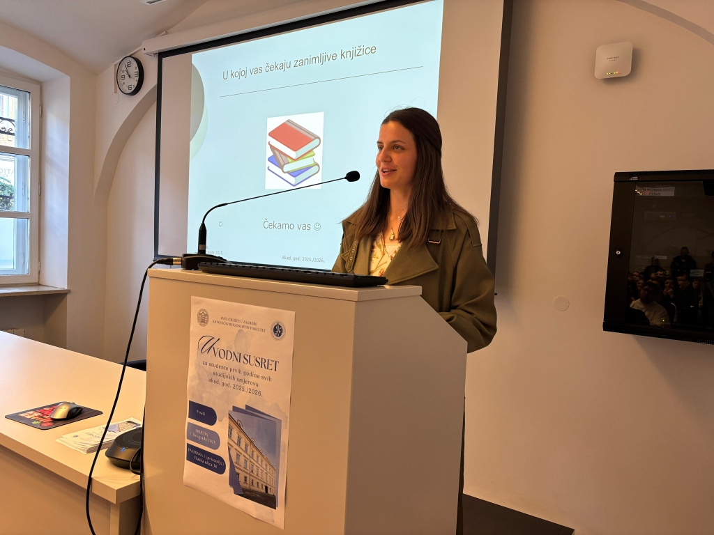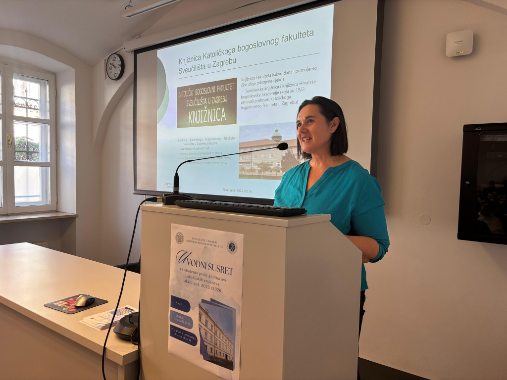 Voditeljica Knjižnice KBF-a Vlatka Božičević, dipl. kateh. i dipl. knjižničarka potom je upoznala studente s radom Knjižnice pri čemu im je ukazala na mogućnosti koje Knjižnica pruža u vidu pomoći studentima u pronalaženju potrebne literature kako za tijek njihovoga redovitog učenja i istraživanja, tako i u izradi seminarskih radova, referata i ostalih studijskih projekata.