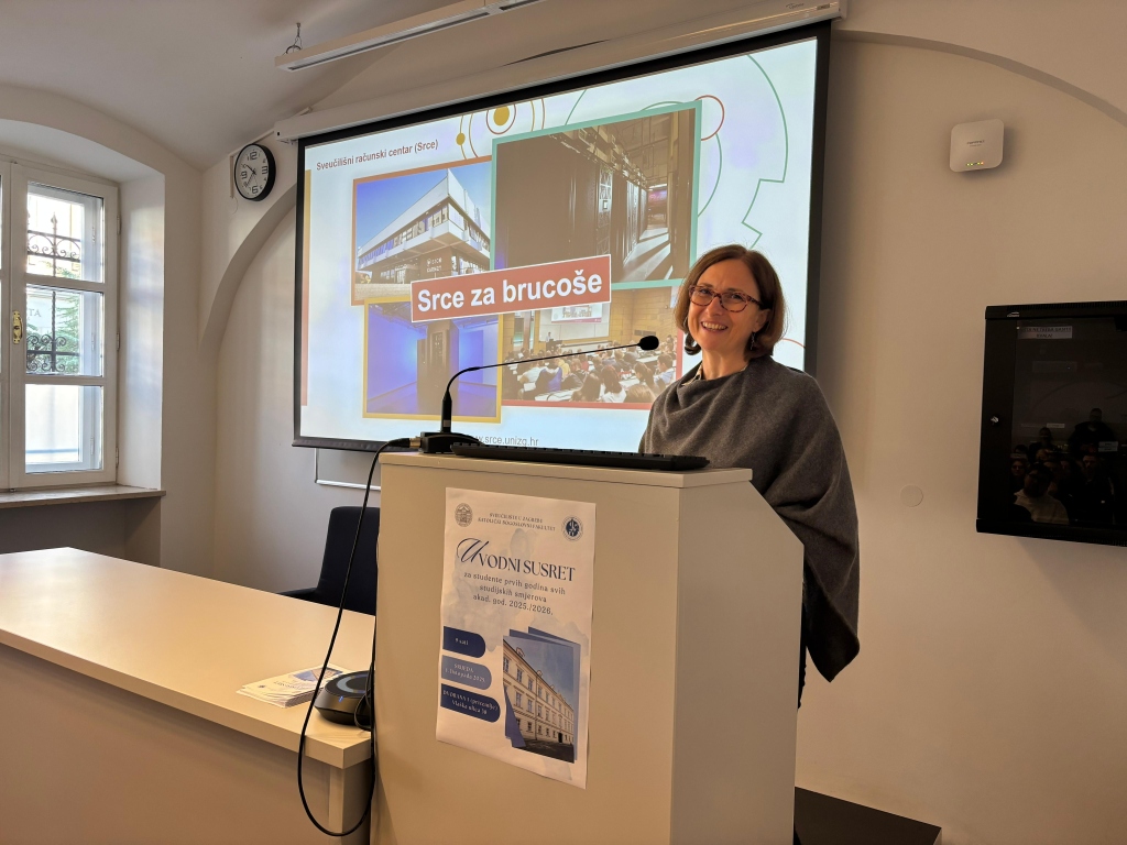 Nakon kratke pauze predstavnica Sveučilišnoga računskog centra (Srca) gospođa Dejana Carić ukratko je predstavila rad Srca i upoznala studente s mogućnostima koje se nude na području izgradnje, održavanja i podrške u uporabi moderne računalne, komunikacijske, posredničke, podatkovne i informacijske infrastrukture (e-infrastrukture), kako bi studenti već na početku studija dobili sveobuhvatnu savjetodavnu i obrazovnu podršku pri primjeni informacijske i komunikacijske tehnologije u procesu obrazovanja.