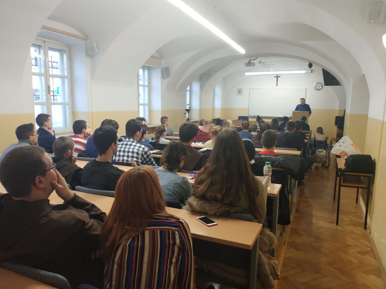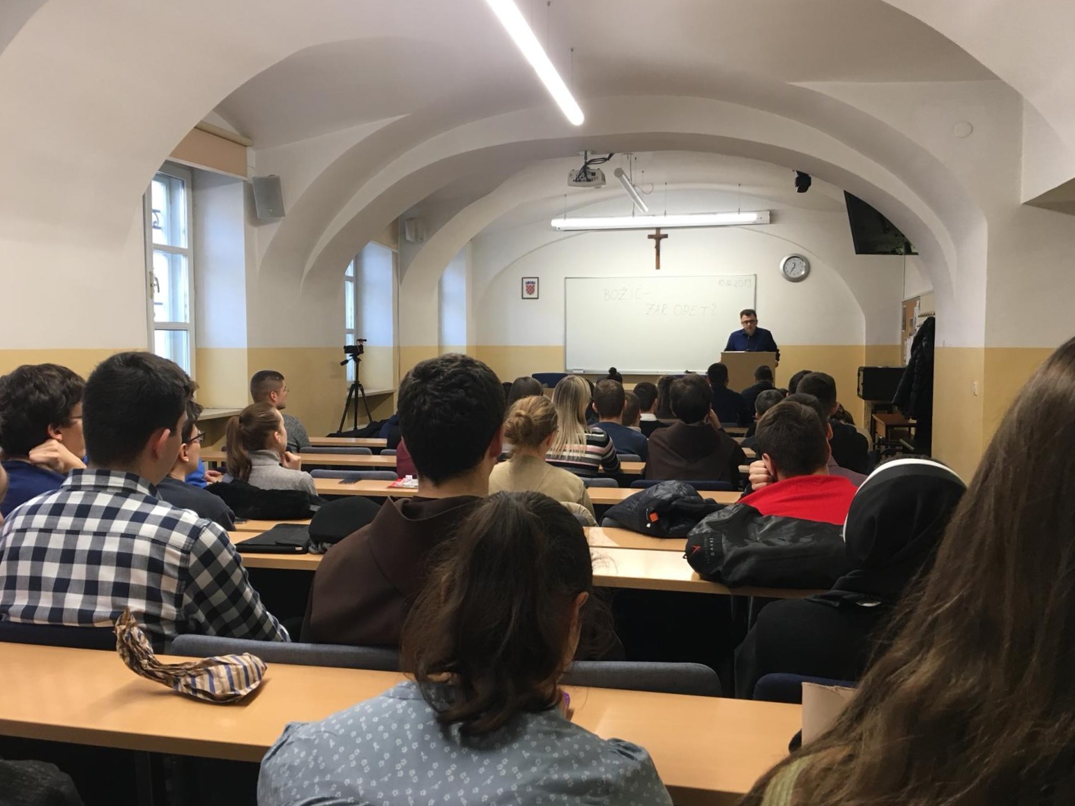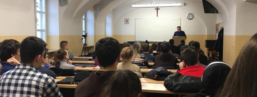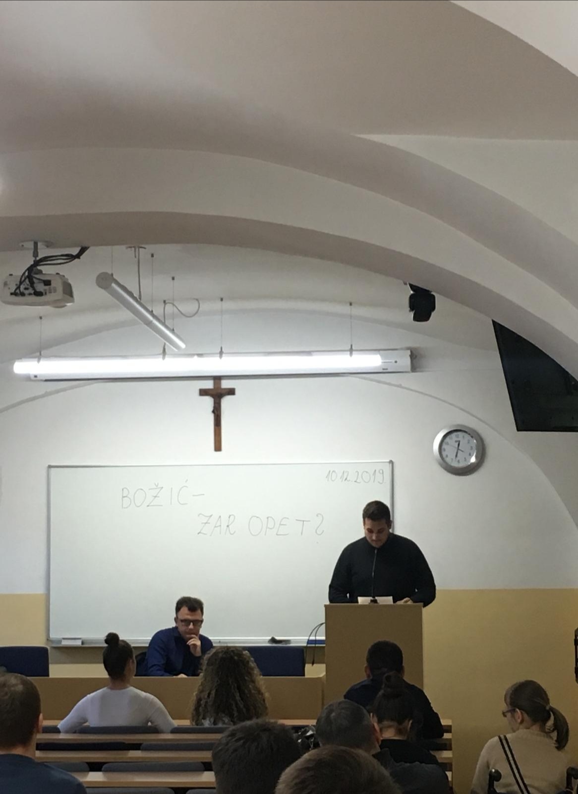 Studentski zbor Katoličkog bogoslovnog fakulteta Sveučilišta u Zagrebu organizirao je prvu tribinu ove akademske godine 2019./20. u dogovoru s profesorom doc. dr. sc. Stipom Kljajićem kao predavačem. Prisustvovalo je mnogo studenata u pratnji nekoliko profesora. Tribina se održala u utorak 10. 12. 2019. s početkom u 12:30h na našem fakultetu. S obzirom na liturgijsko vrijeme došašća u kojem se nalazimo, temu ove tribine posvetili smo nadolazećem blagdanu Božića. Pod nazivom Božić – zar opet? željeli smo u tome duhu promišljati o otajstvu Kristova utjelovljenja i njegovoj povezanosti i odnosu prema današnjem čovjeku. Kao suvremeni ljudi, dostupni su nam mnogi sadržaji koji nas udaljuju od smisla Božjeg silaska među nas. Na tome tragu, uspješno smo završili tribinu podsjetivši se kao okupljena zajednica što je i zašto je Božić. Zahvaljujemo ovim putem i našem profesoru doc. dr. sc. Kljajiću na odazivanju kao predavaču i ostalim kolegama studentima i profesorima koji su došli poslušati izlaganje teme. Pozivamo Vas unaprijed na sljedeće tribine čija je realizacija predviđena početkom ljetnog semestra 2020. godine.