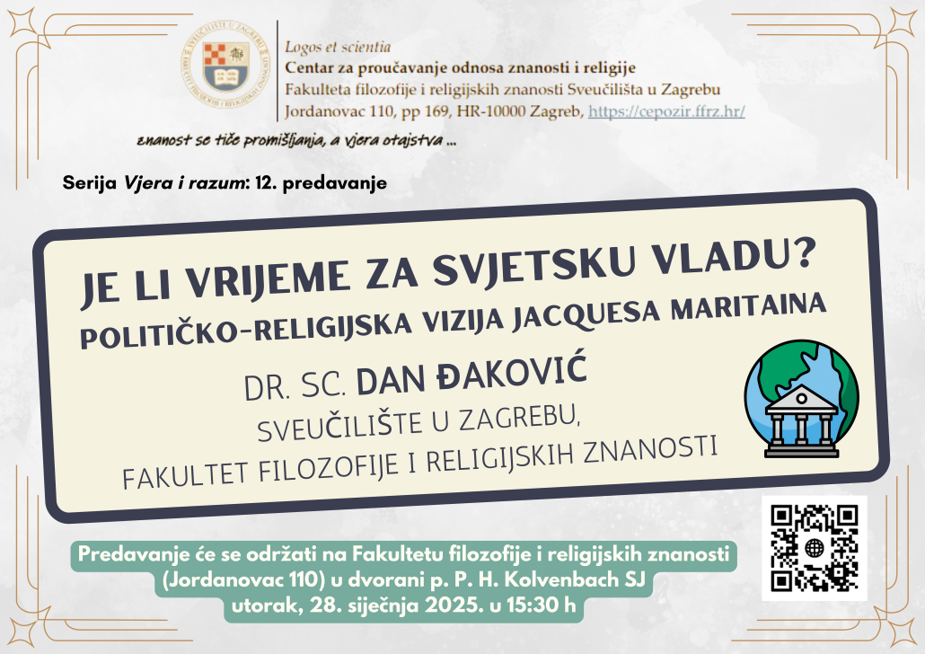 U utorak, 28. siječnja u 15.30 dr. sc. Dan Đaković održat će predavanje na temu: Je li vrijeme za svjetsku vladu? Političko-religijska vizija Jacquesa Maritaina na Fakultetu filozofije i religijskih znanosti.