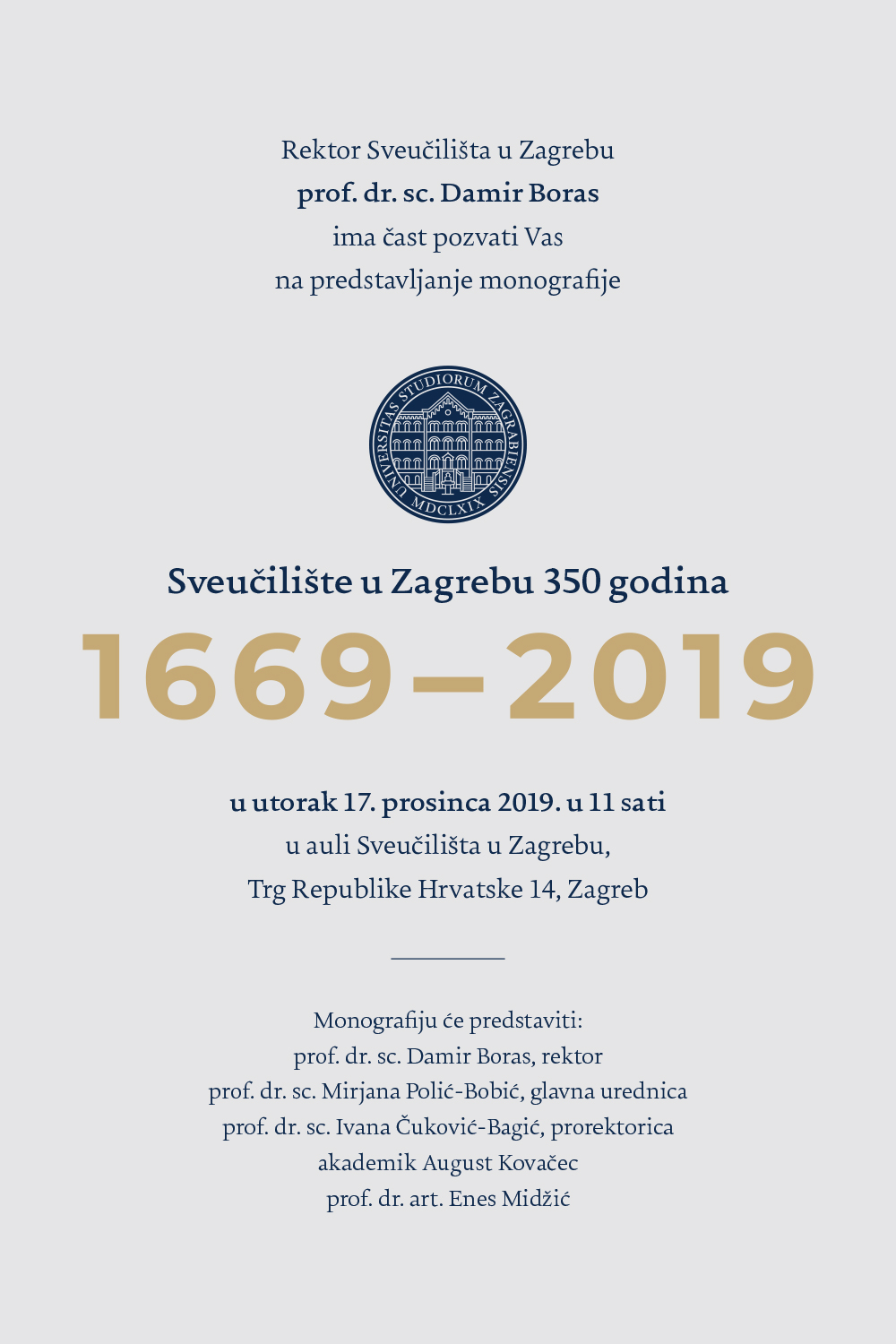Rektor Sveučilišta u Zagrebu, prof. dr. sc. Damir Boras poziva na predstavljanje monografije Sveučilište u Zagrebu 350 godina, u utorak, 17. prosinca 2019 . u 11 sati u auli Sveučilišta u Zagrebu, Trg Republike Hrvatske 14, Zagreb.