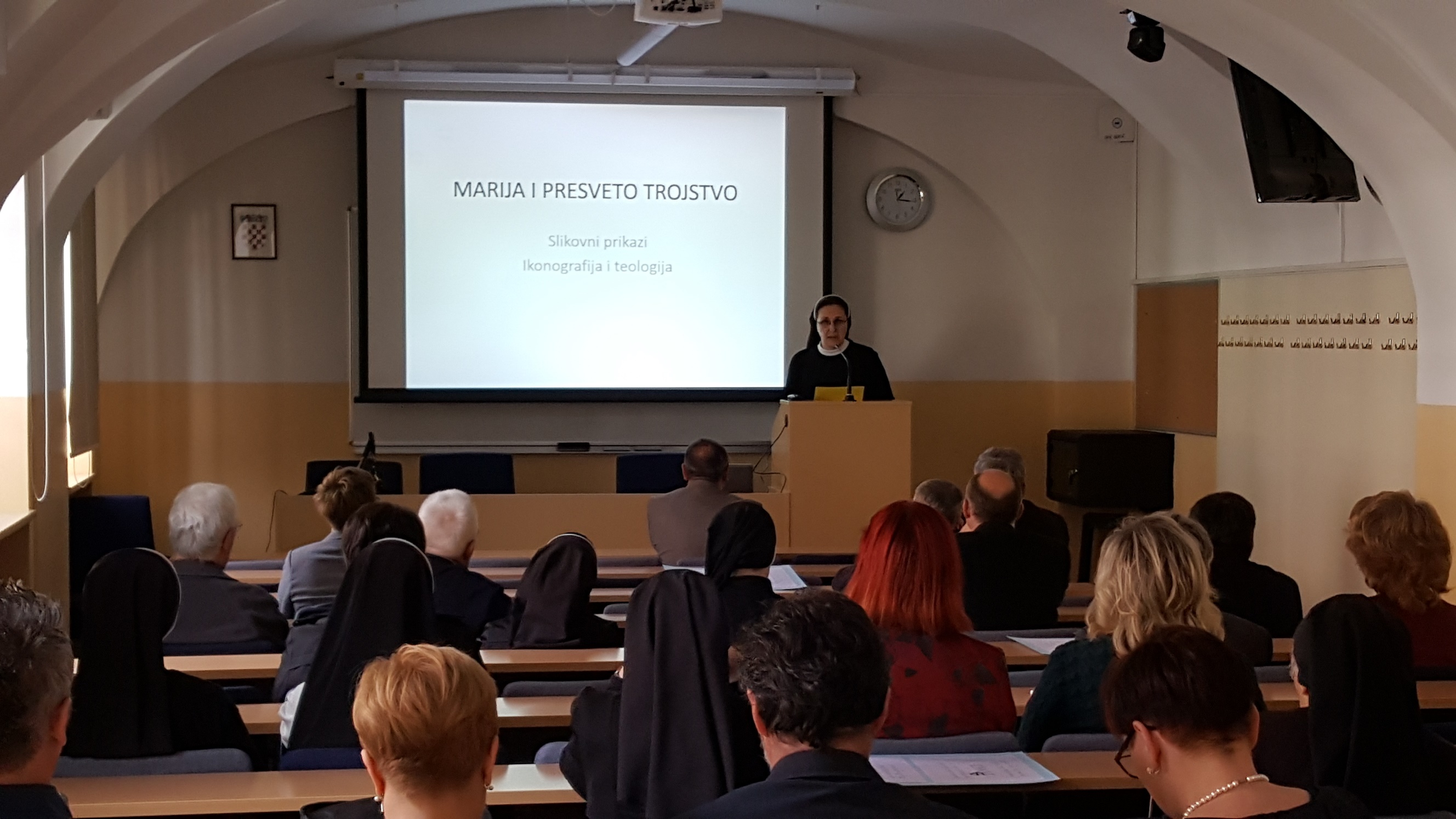 Slijedilo je prigodno izlaganje: „Marija na slikovnim prikazima Presvetoga trojstva. Ikonografija i teologija“, koje je održala doc. dr. sc. Marija Pehar. Prikazala je povijesni kontekst, ikonografske elemente i teološki sadržaj odabranih slikovnih prikaza. Uvodno je istaknula da prikazi Trojstva s Marijom idu za tim da naglase neke aspekte ekonomijskoga Trojstva. Blaženu Djevicu Mariju prikazuju u bliskom odnosu božanskih osoba Oca, Sina i Duha Svetoga. Najraniji prikazi Marije s prizorima navještenja te života Marije i Isusa ukazuju barem sekundarno na Trojstvo. U ranijim stoljećima je slikovno bio prikazivan i kraj njezina života ili tzv. usnuće, a na njima je redovito Krist prikazan kao nazočan u trenutku majčina usnuća. Kao poseban tip doc. Pehar je istaknula prizor Marije pod križem u zajedništvu s Ocem i Duhom Svetim, po kojemu se teološki naglašavalo Marijino suotkupiteljstvo, a pobožnost se usmjeravala isticanju Marijine boli. Potom je predstavila motiv krunjena Marije, u kojem se u određenom smislu može govoriti o četvorstvu, „ali ne u tom smislu da bi se Mariju izjednačavalo s osobom Presvetoga Trojstva jer je stvorenje i ne može se staviti na istu razinu s Bogom i utjelovljenom riječi. Ipak su teološki opravdani ti prikazi ukoliko je teološki opravdan i govor o njezinu uznesenju koji govori o tome da se radi o Mariji kao početku ostvarenja Božjega sna sa svakim čovjekom i cjelokupnim stvorenjem prema kojemu će u eshatološkoj konačnici sve stvorenje biti u Bogu i Bog u svemu,“ kazala je doc. Pehar te zaključila da sve što prikazi Marijina krunjenja govore o Mariji i njezinu milosnom uzdignuću, može se primijeniti na Crkvu i na svakoga pojedinog čovjeka.