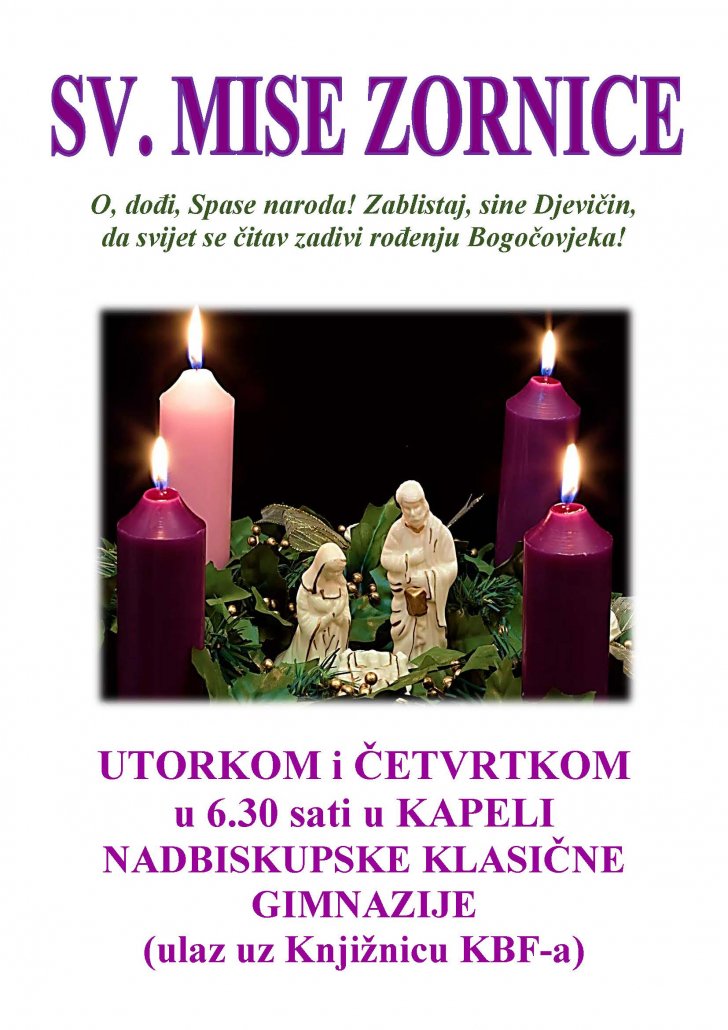 Utorkom i četvrtkom u 6.30 sati u kapeli Nadbiskupske klasične gimnazije (ulaz uz Knjižnicu Fakulteta) slavit ćemo SV. MISE ZORNICE, na kojima će aktivno sudjelovati (pjevanjem, čitanjem, ministriranjem, pripremom molitava vjernika) pojedina godišta studenata svih studijskih smjerova, počevši sa članovima Studentskoga zbora, pa od pete godine do prve.