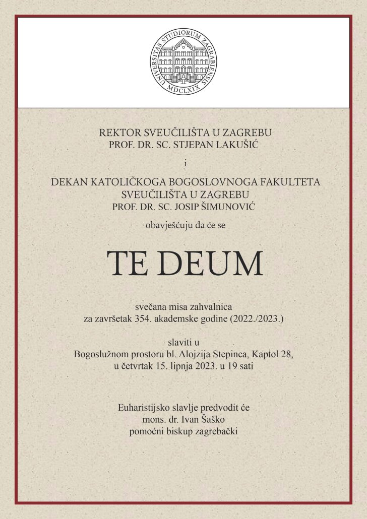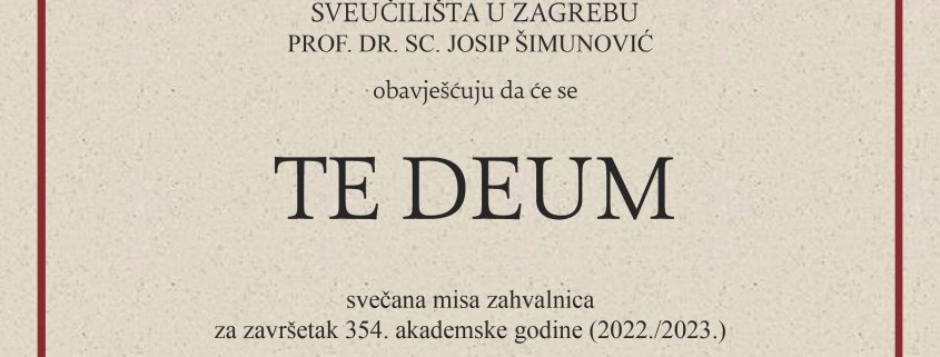 Svečani Te Deum za akademsku godinu 2022./2023. održat će se u četvrtak, 15. lipnja 2023. u 19:00 sati u Bogoslužnom prostoru bl. Alojzija Stepinca, Kaptol 28