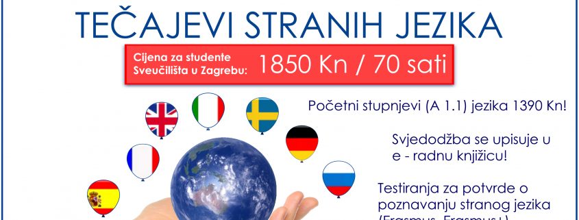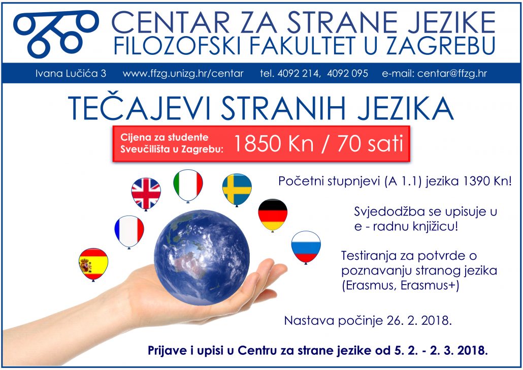 Centar za strane jezike Filozofskog fakulteta Sveučilišta u Zagrebu organizira akreditirane tečajeve stranih jezika u ljetnom semestru 2017./2018. g., uz popust za studente Sveučilišta po cijeni od 1850,00 kn.